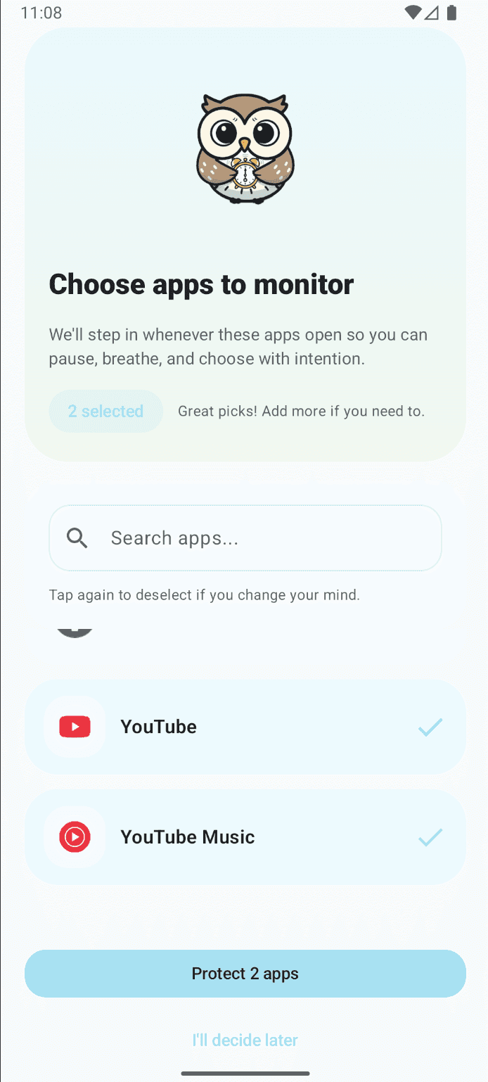 Select the apps that drain your focus. Undoomscroll watches for when you open them, stepping in with the right intervention before the scroll begins.