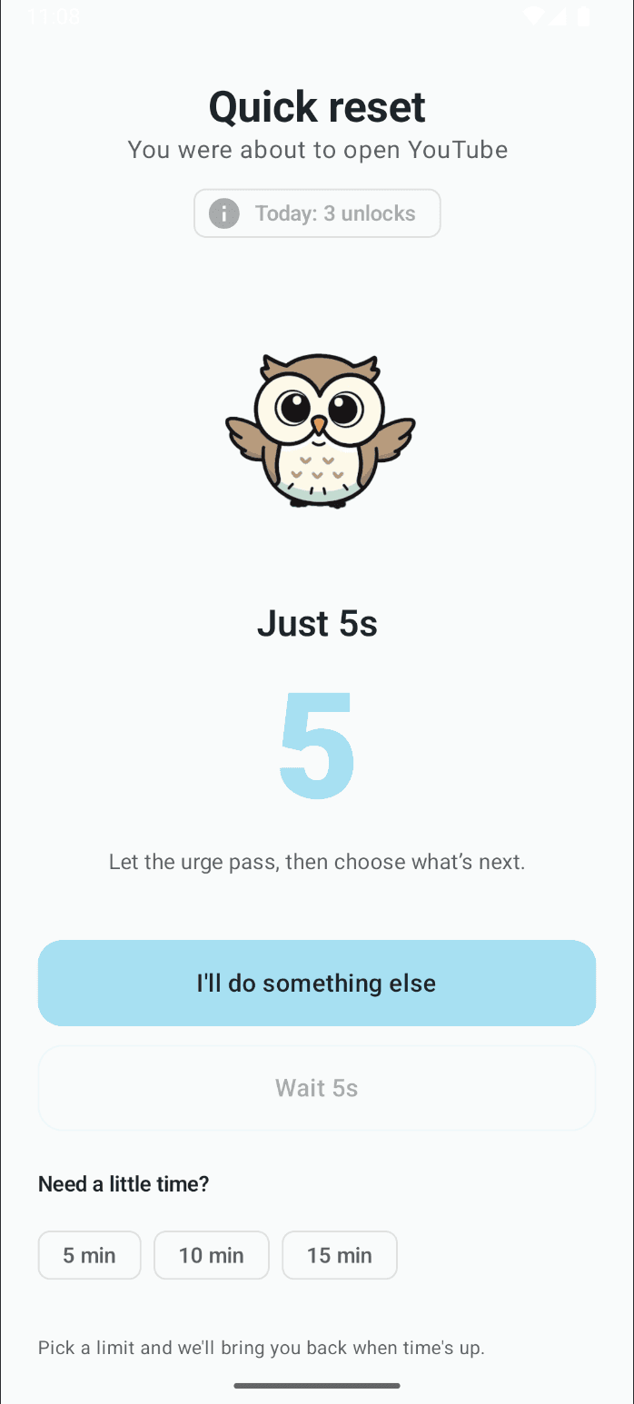 From calming breathing sessions and countdowns to quick guided puzzles and reflective prompts — choose how you want Undoomscroll to bring you back to control.